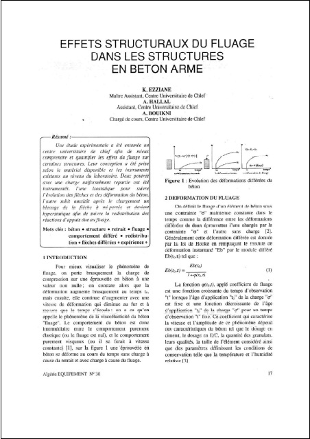 - ItemLa gammadensimétrie et ses applications(ENTP - Alger, 1999-03) Belas Belaribi, N.; Kadri, T.Le béton est un matériau qui a une structure complexe. Divers processus influent sur lui : chimiques, tels que l'hydratation du ciment; physiques tels que les échanges thermiques et hydriques. Ces échanges hydriques qui résultent du mouvement de l'eau et de répartition dans un élément de béton sont d'une importance telle qu'elle puisse Influer sur les caractéristiques mécaniques du béton. En effet dans les bétons courants pour des raisons de maniabilité et de facilité de mise en œuvre, on met lors de la fabrication beaucoup plus d'eau qu'il n'en faut pour assurer la réaction d'hydratation du ciment. Dès son jeune âge, le béton se trouve alors en déséquilibre hygrométrique avec le milieu extérieur à cause du surplus d'eau contenu dans ses pores. Une des méthodes utilisées pour l'évaluation des variations hydriques responsables de la modification des propriétés des bétons est la densimétrie par absorption de rayons gamma : la gammadensimétrie. Nous présenterons cette technique efficace en expliquant son principe de fonctionnement et quelques-unes de ses nombreuses applications.