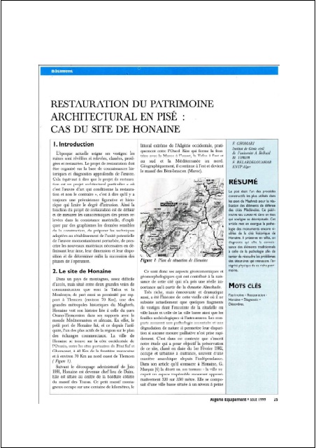- ItemRestauration du patrimoine architectural en pisé : cas du site de Honaine(ENTP - Alger, 1999-08) Ghomari, F.; Belabdelouhab, F.Le pisé était l'un des procédés constructifs les plus utilisés dans les pays du Maghreb pour la réalisation des éléments de défense des cités Médiévales. Ce patrimoine est conservé dans un état qui souligne sa décrépitude. Cet article met en exergue la pathologie des monuments encore visibles de la cité historique de Honaine. Il présente en effet, un diagnostic qui allie la connaissance des éléments traditionnels à celle de la pathologie afin de tenter de résoudre les problèmes des désordres qui menacent l'intégrité physique de ce riche patrimoine.